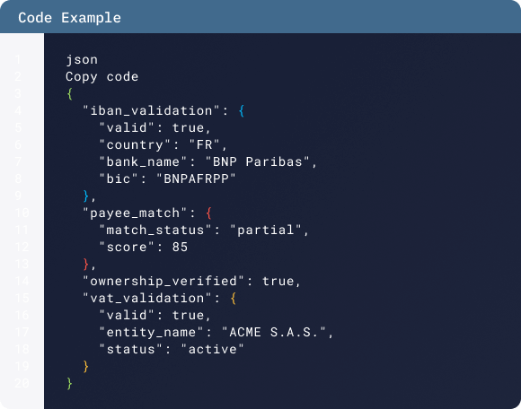 One response, all key checks — IBAN validity, payee match, ownership, and VAT status — returned in real time.